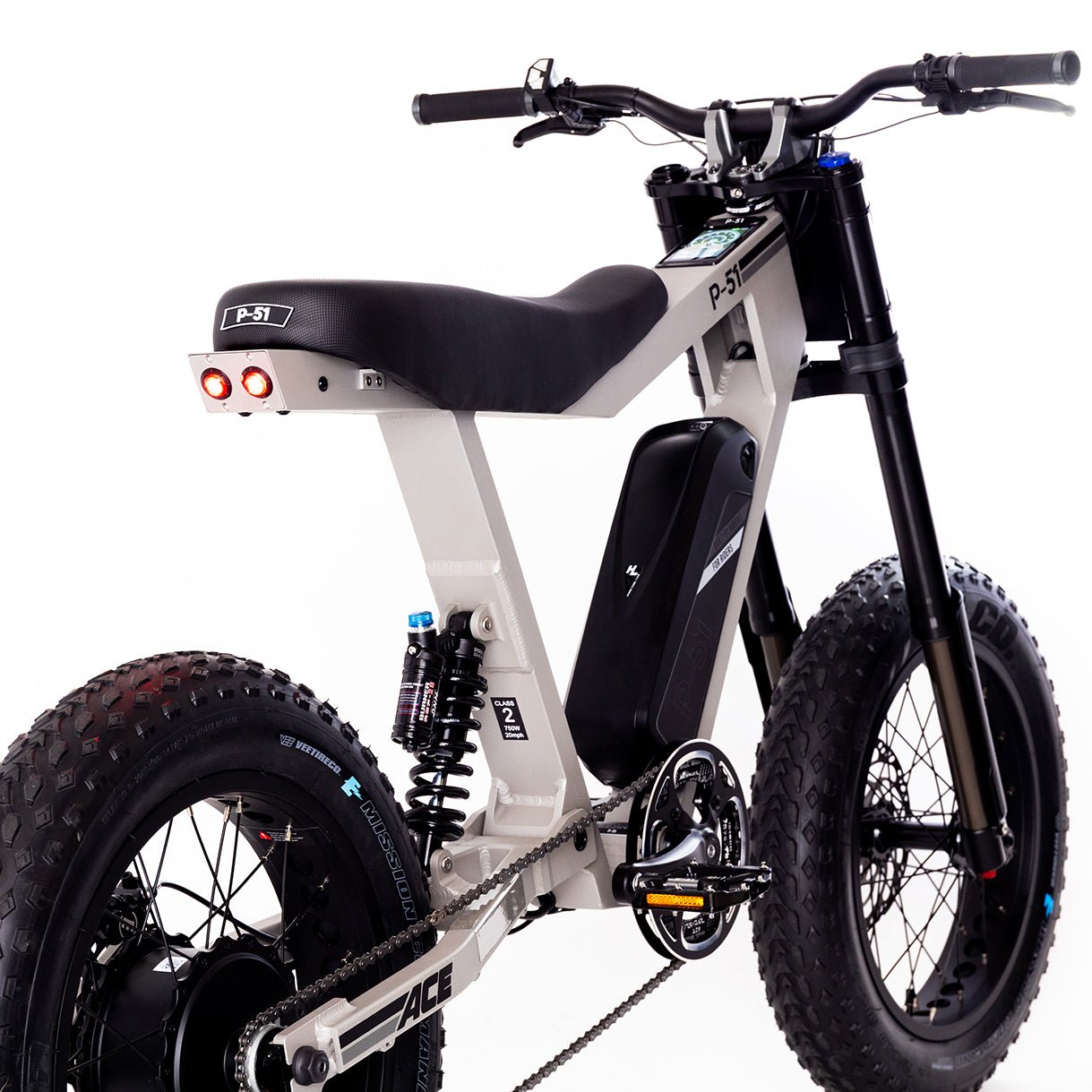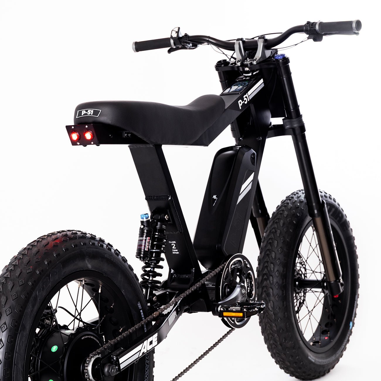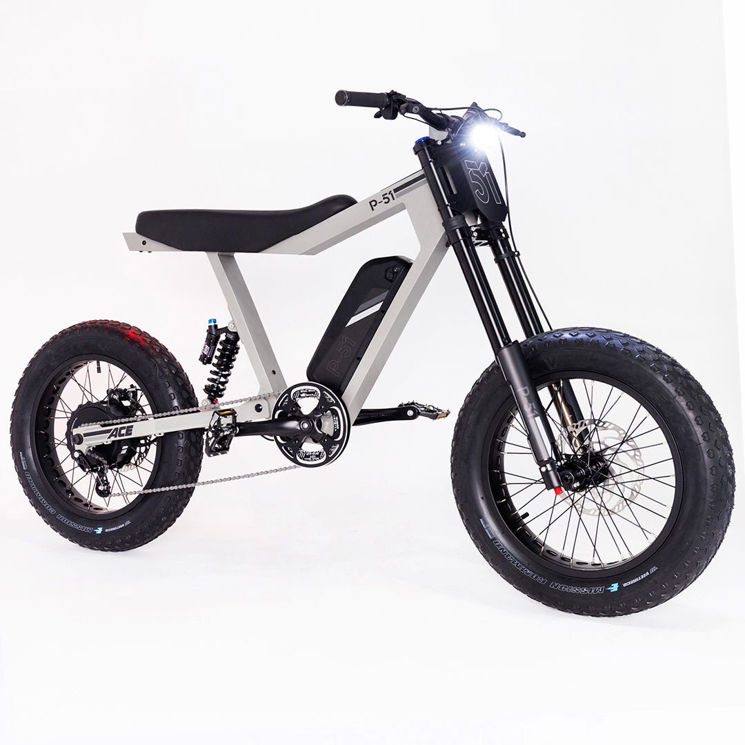 Unlike most e-bikes, the P-51 features an integrated 12-volt system that powers a robust 1200 lumen LED front headlight, delivering exceptional nighttime visibility