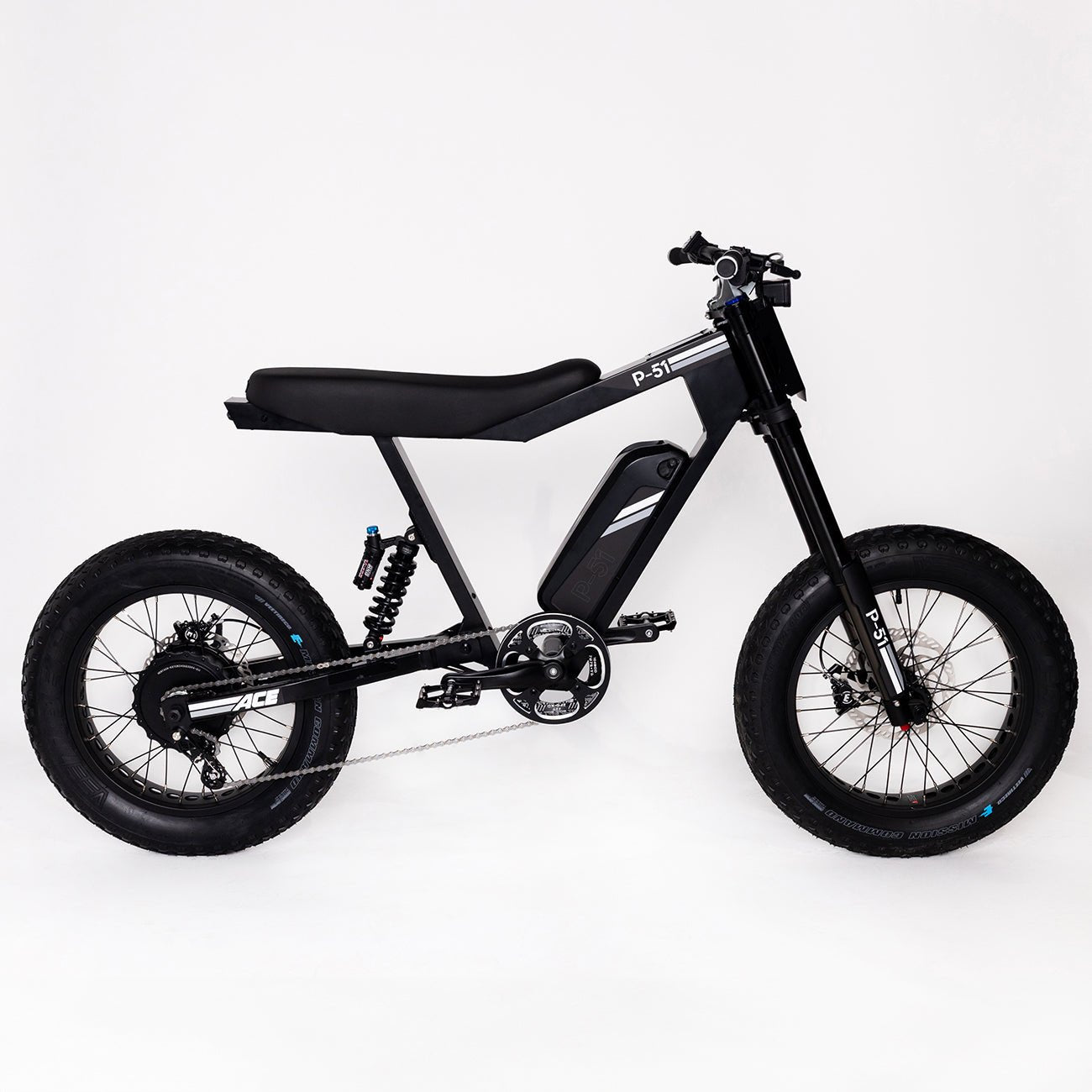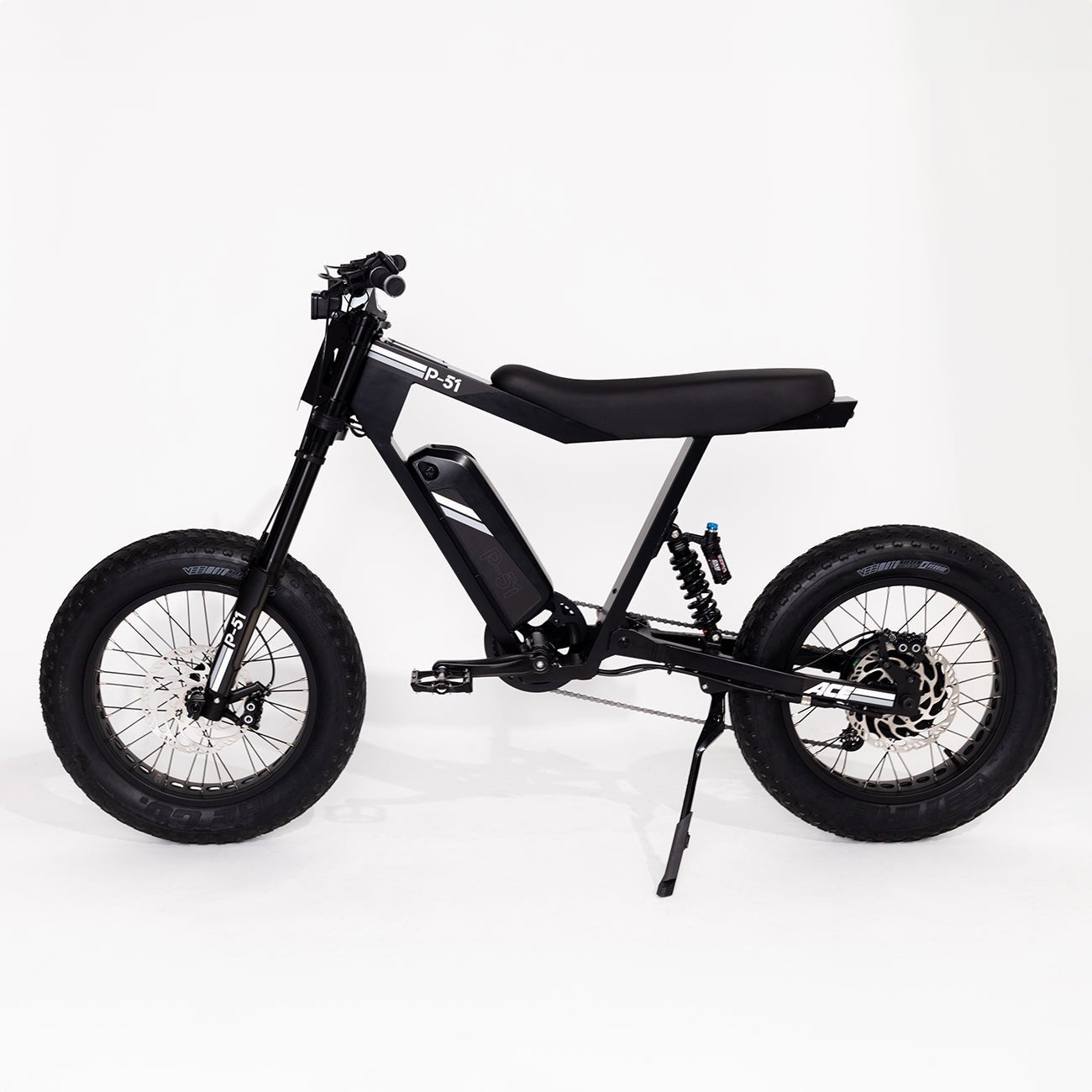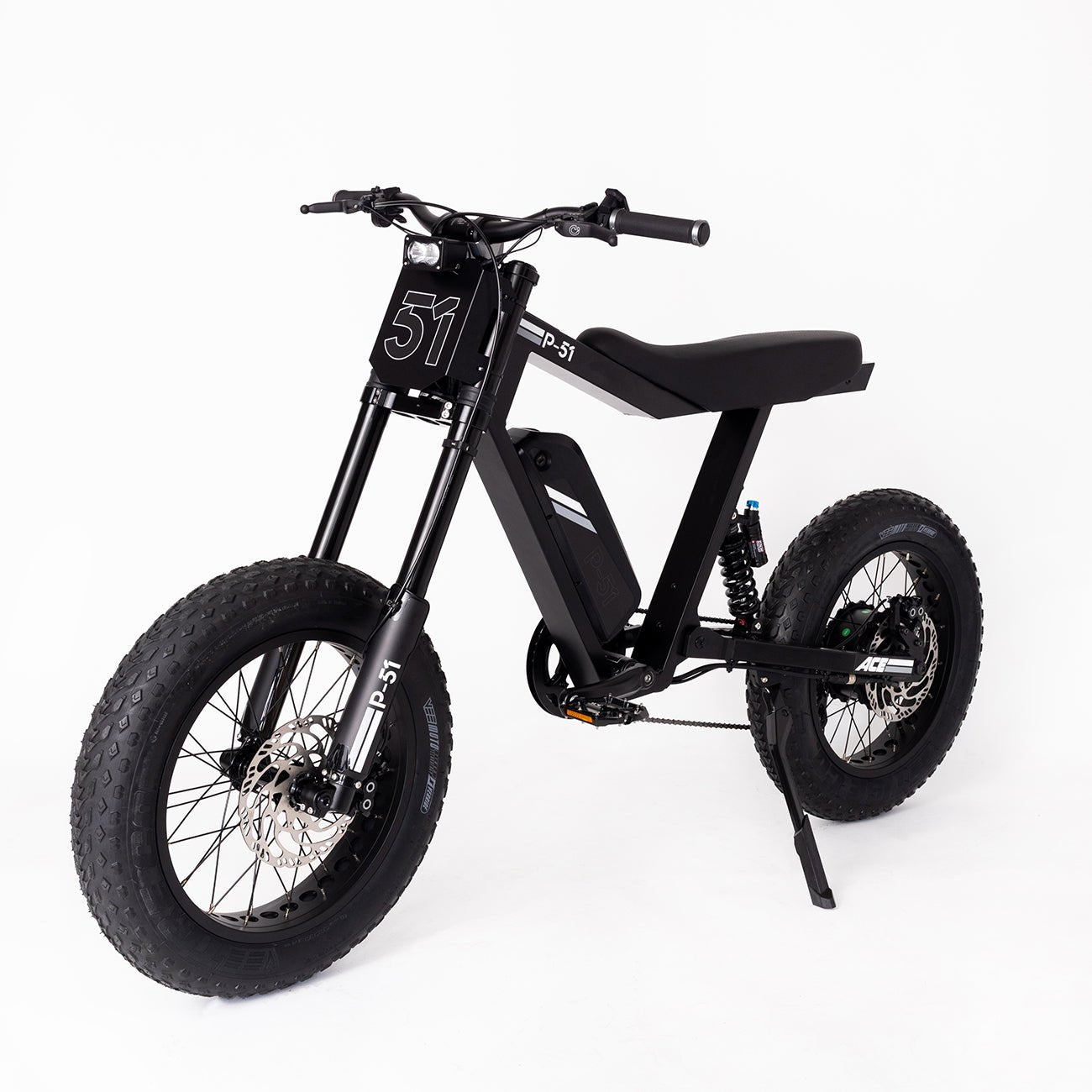Unlike most e-bikes, the P-51 features an integrated 12-volt system that powers a robust 1200 lumen LED front headlight, delivering exceptional nighttime visibility